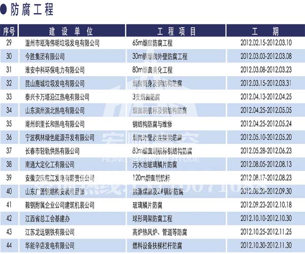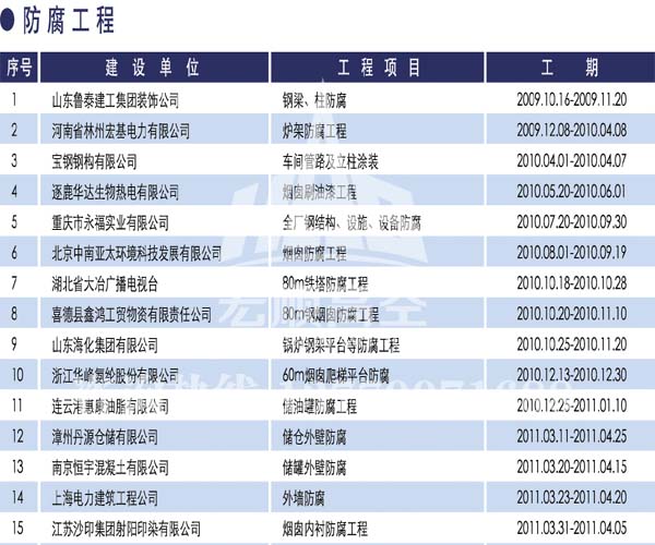 - 宏順建設(shè)核心技術(shù) 宏順建設(shè)專業(yè)防腐各種水塔防腐,儲(chǔ)油罐防腐,管道防腐,吊機(jī)防腐,龍門吊防腐,水泥筒倉(cāng)防腐工程,有多年的成功經(jīng)驗(yàn),施工業(yè)績(jī)遍布全國(guó)各地... 了解詳情